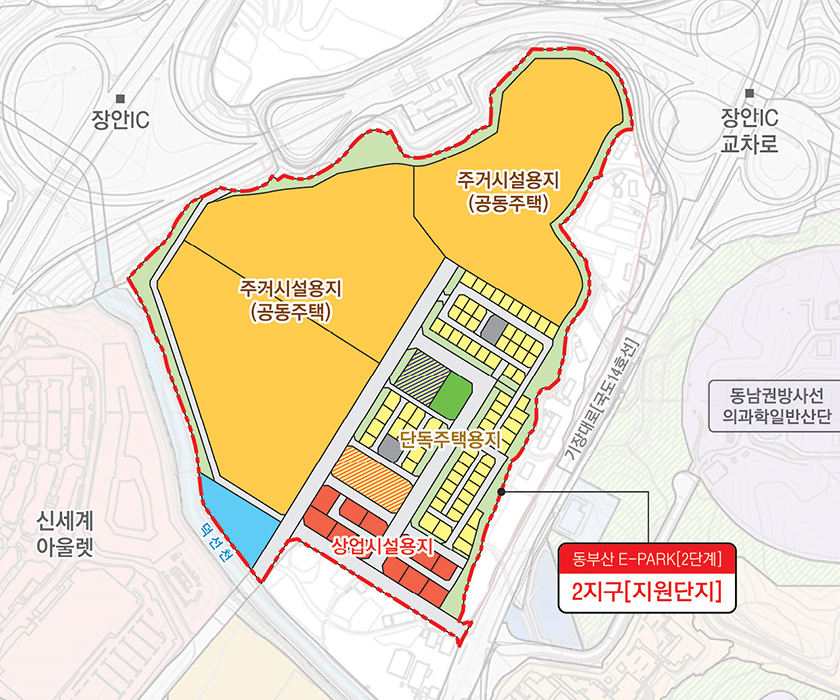 2지구는 동남권 방사선 의ㆍ과학 일반산업단지, 장안지구 택지개발사업구역 등과 접하고 있어 향후 주변지역과의 연계를 통한개발 가능성이 높은 지역입니다.
